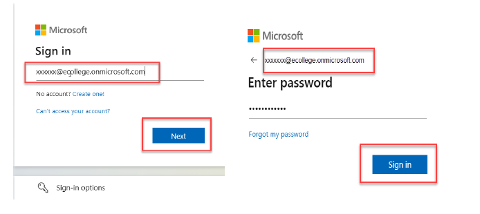 Go to https://login.microsoftonline.com and sign in using your College–issued Microsoft account (Office 365), for example: XXXXXX@ecollege.onmicrosoft.com, along with the provided temporary password.