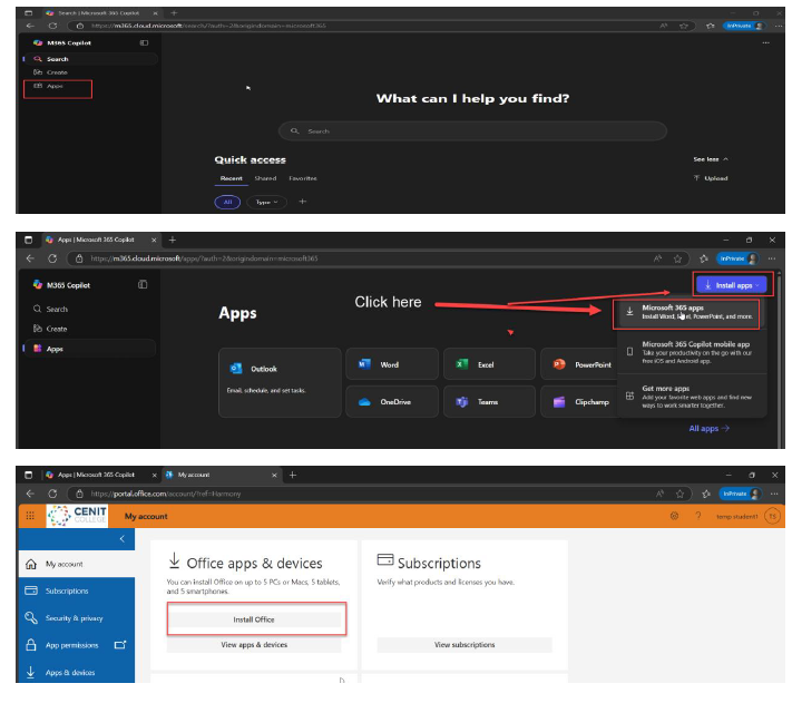 - Once signed in, click Install apps from the homepage.