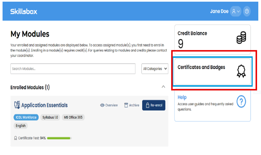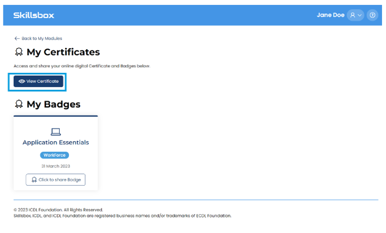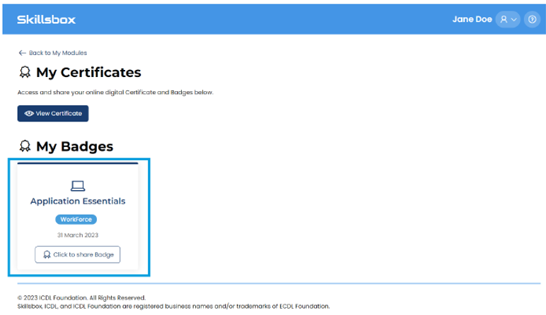 - Your ICDL module badge (e.g. Application Essentials) will be displayed.